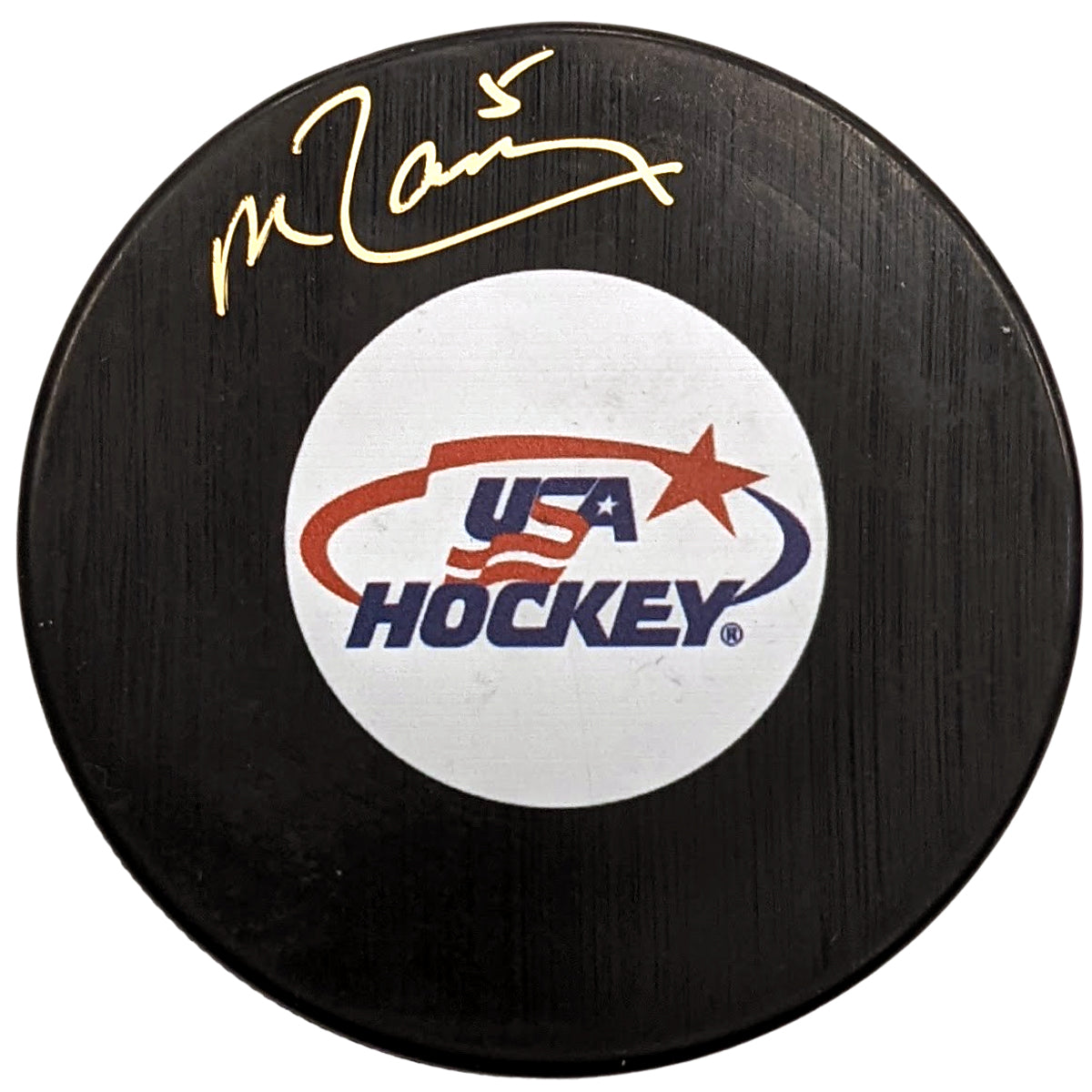 USA Hockey logo puck personally signed by 1980 USA Hockey gold medalist Mike Ramsey.