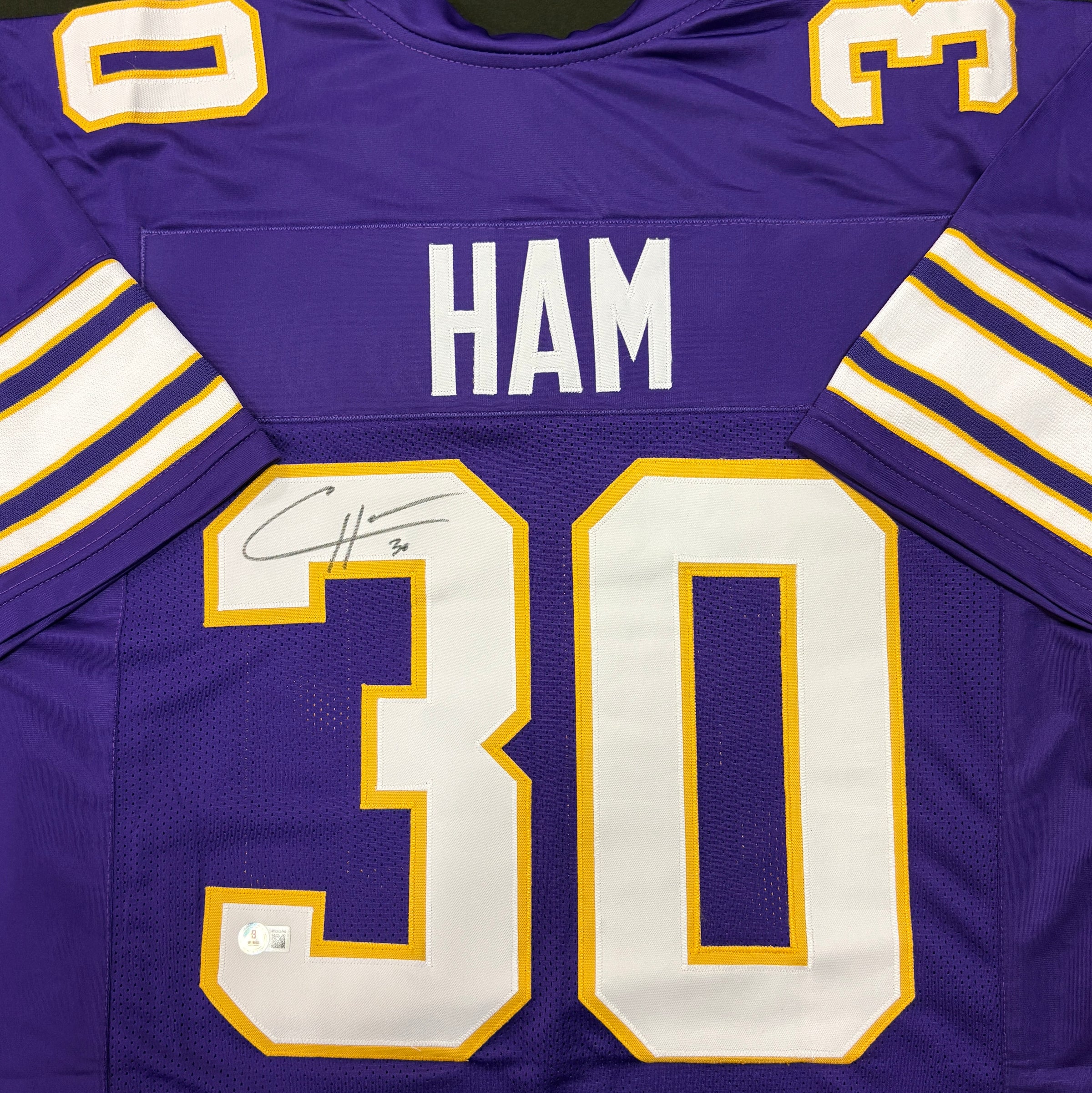 Pro-style jersey with no team logos or word marks signed by C.J. Ham. The jersey has sewn on name and numbers. Size XL.