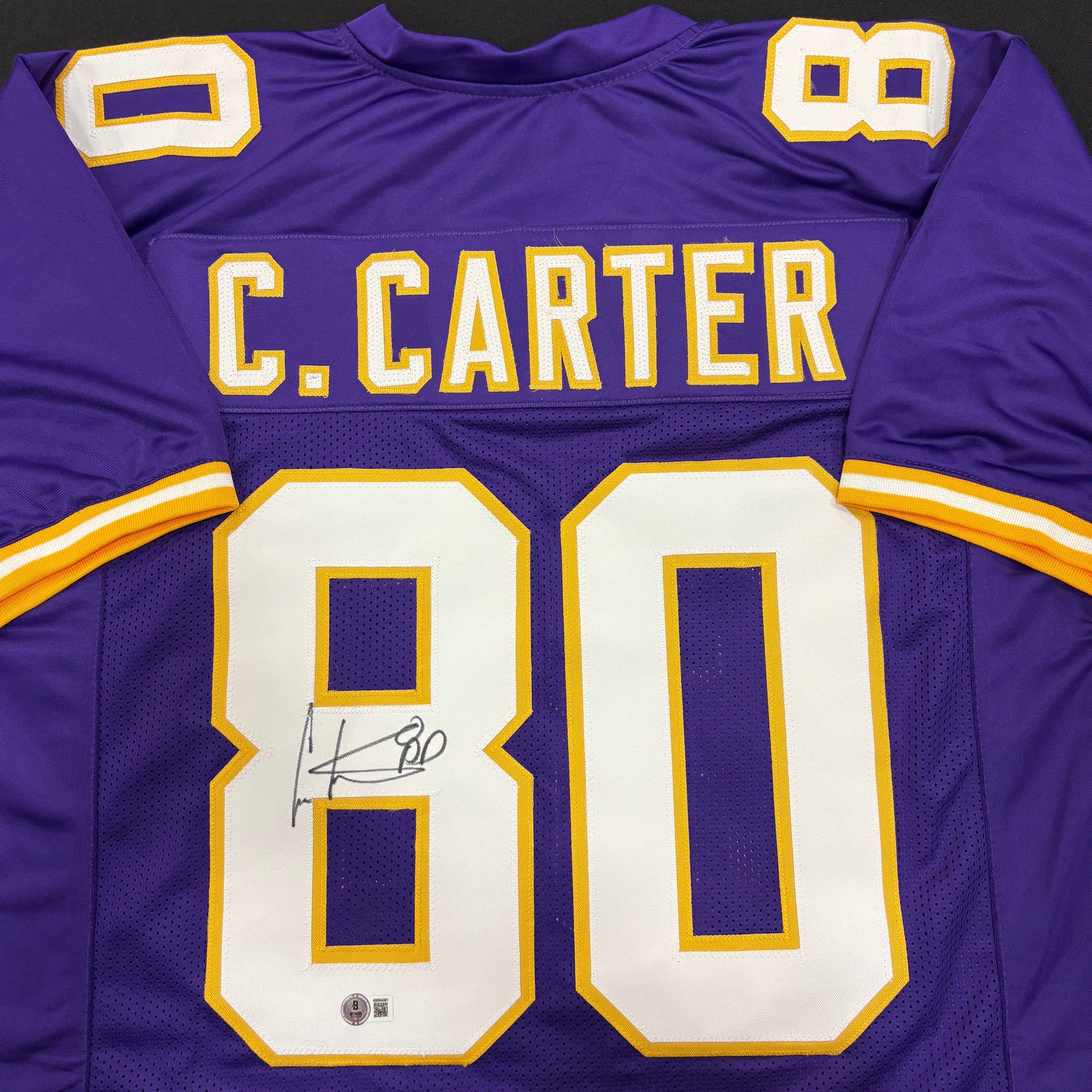 Pro-style jersey with no team logos or word marks signed by Cris Carter! The jersey has sewn on name and numbers. Size XL.