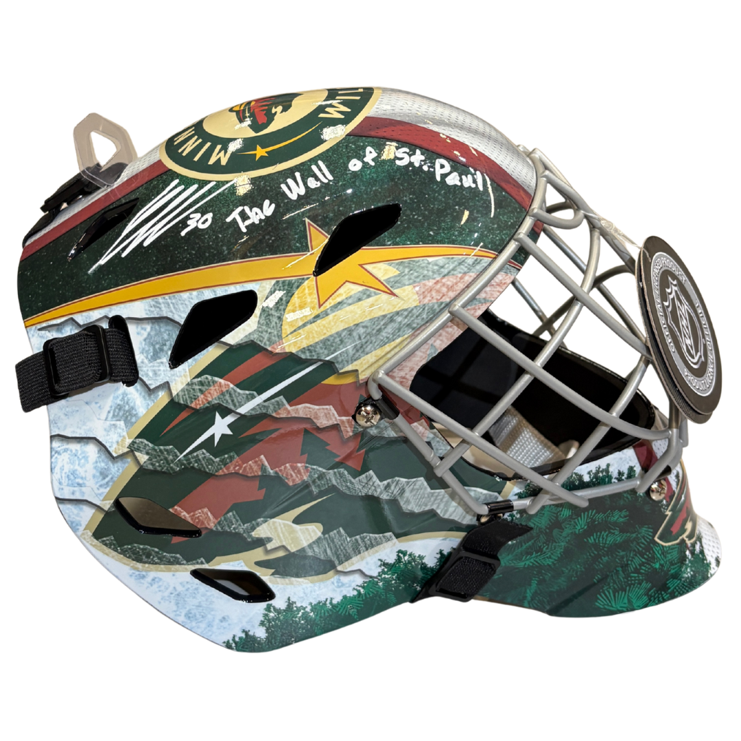 Jesper Wallstedt autographed Wild full-size goalie mask. Jesper added "The Wall Of St. Paul" inscription.