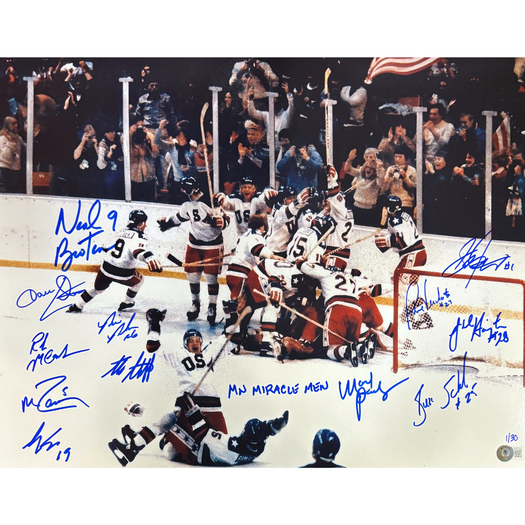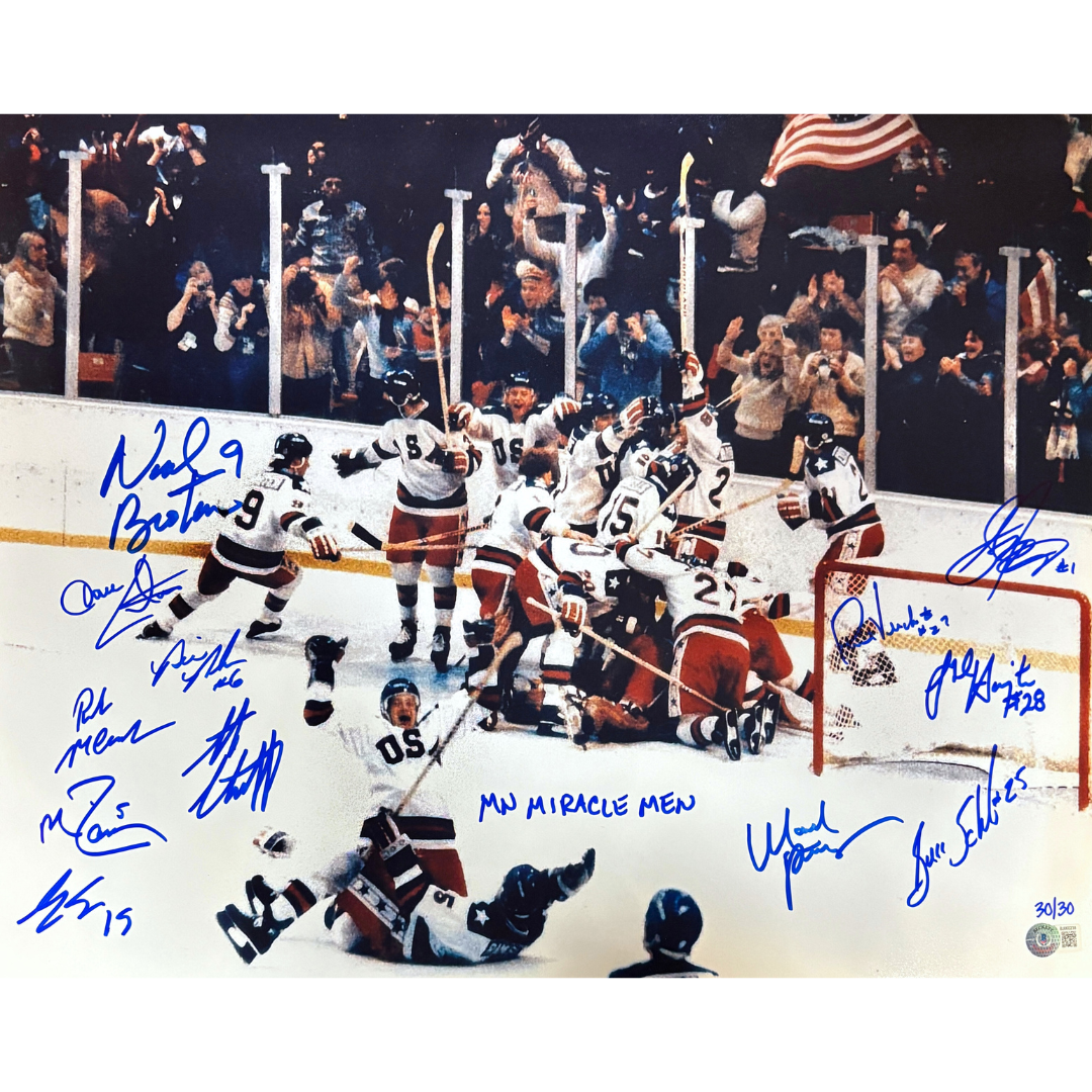 Miracle on Ice 16x20 celebration photo autographed by all twelve Minnesota members of the 1980 US Olympic Hockey Team: Bill Baker, Neal Broten, Dave Christian, Steve Christoff, John Harrington, Steve Janaszak, Rob McClanahan, Mark Pavelich, Mike Ramsey, Buzz Schneider, Eric Strobel, and Phil Verchota.