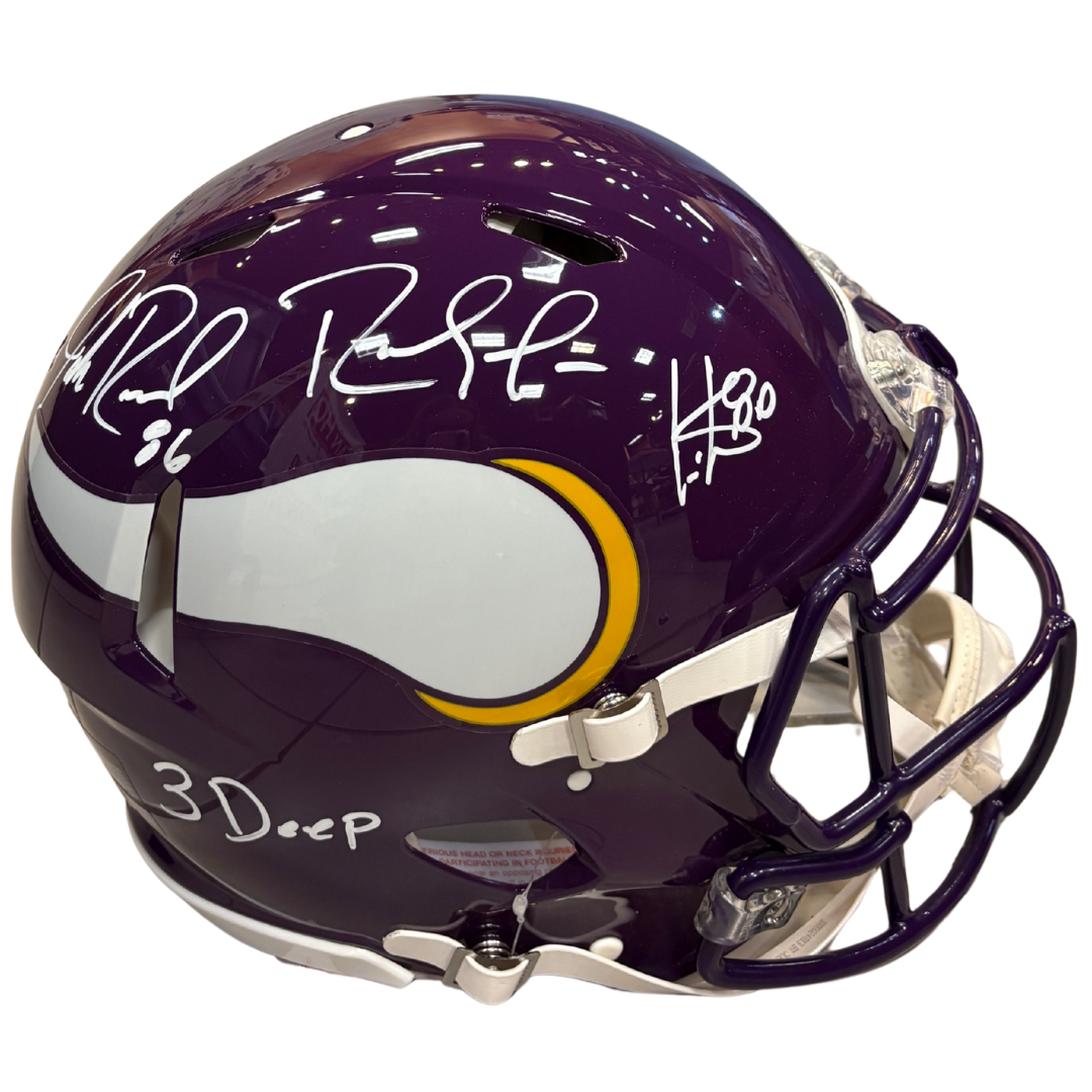 Randy Moss, Cris Carter, and Jake Reed autographed Vikings full-size authentic speed helmet. Jake added the "3 Deep" inscription. You will receive the exact one shown.