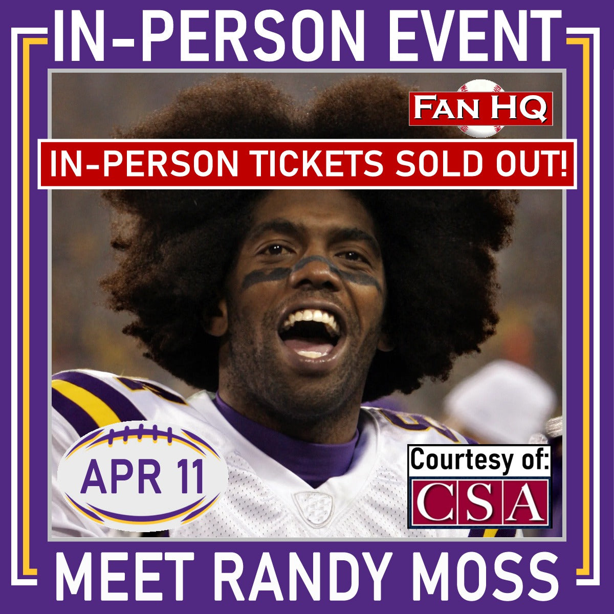 Purchase of each ticket entitles you to ONE mail order or drop off autograph from RANDY MOSS on Your Item.